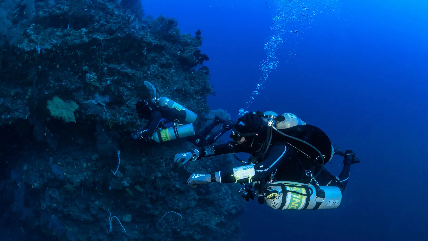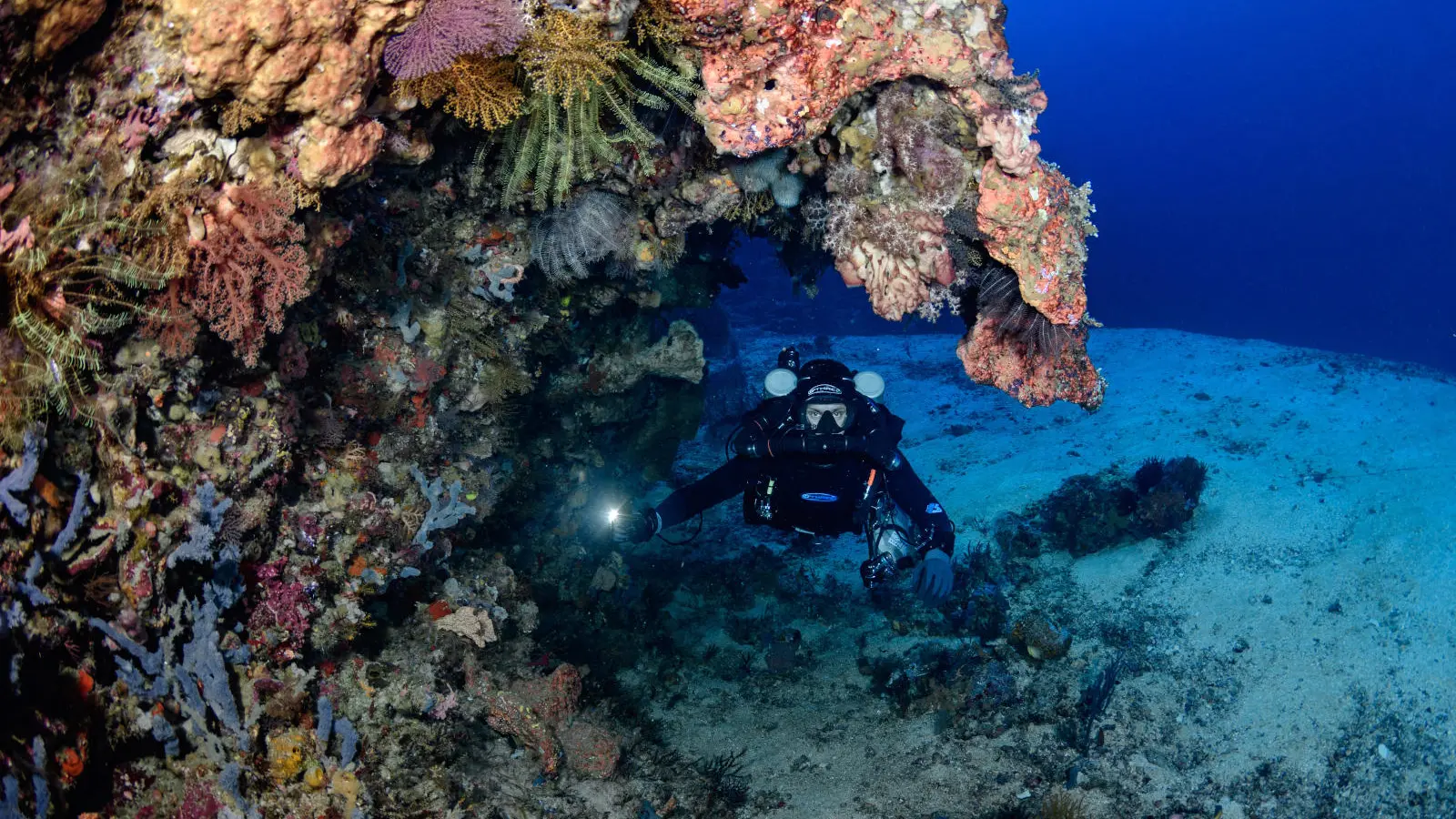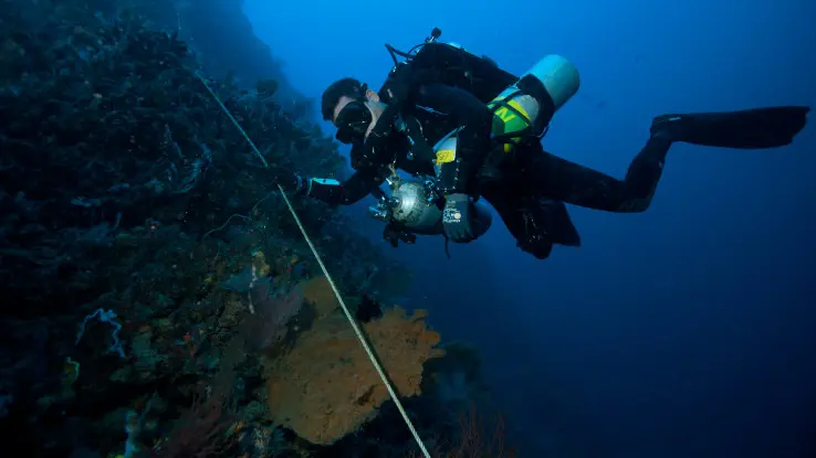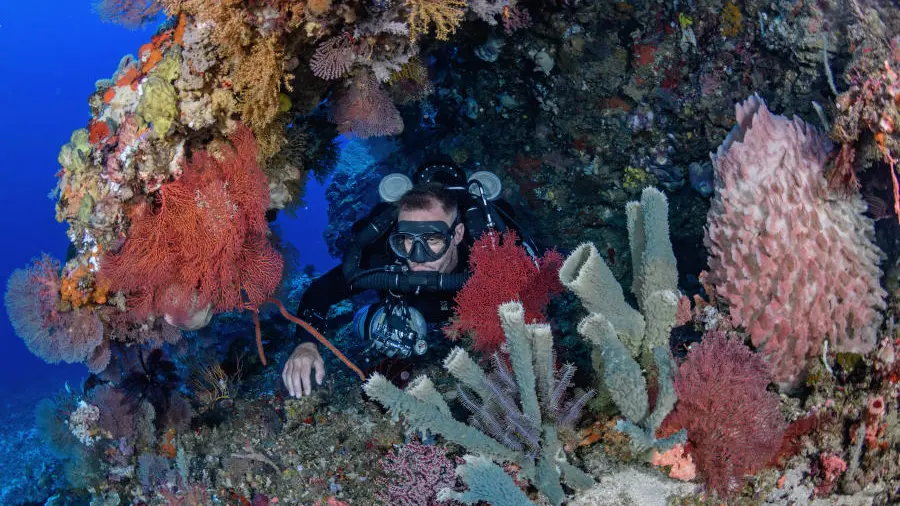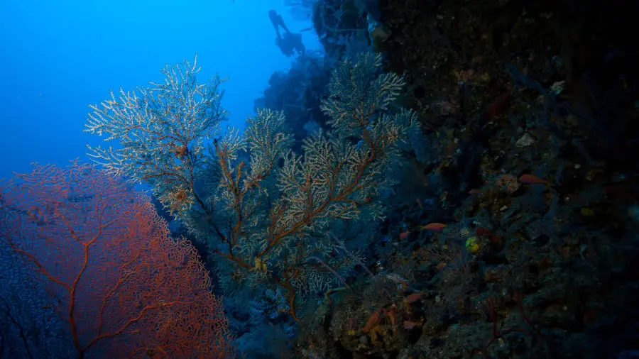 Tangga Wall is situated in the same area as Tunang and Rainbow Reef off the northwest coast of Lombok. The wall starts at 45 meters and descends to depths of 155 meters. It offers a steep descent with unique topography, including ledges and overhangs. The site is home to large tunas, reef fish, and thriving coral ecosystems. The spectacular view from the depths upward makes it a memorable site for technical divers.